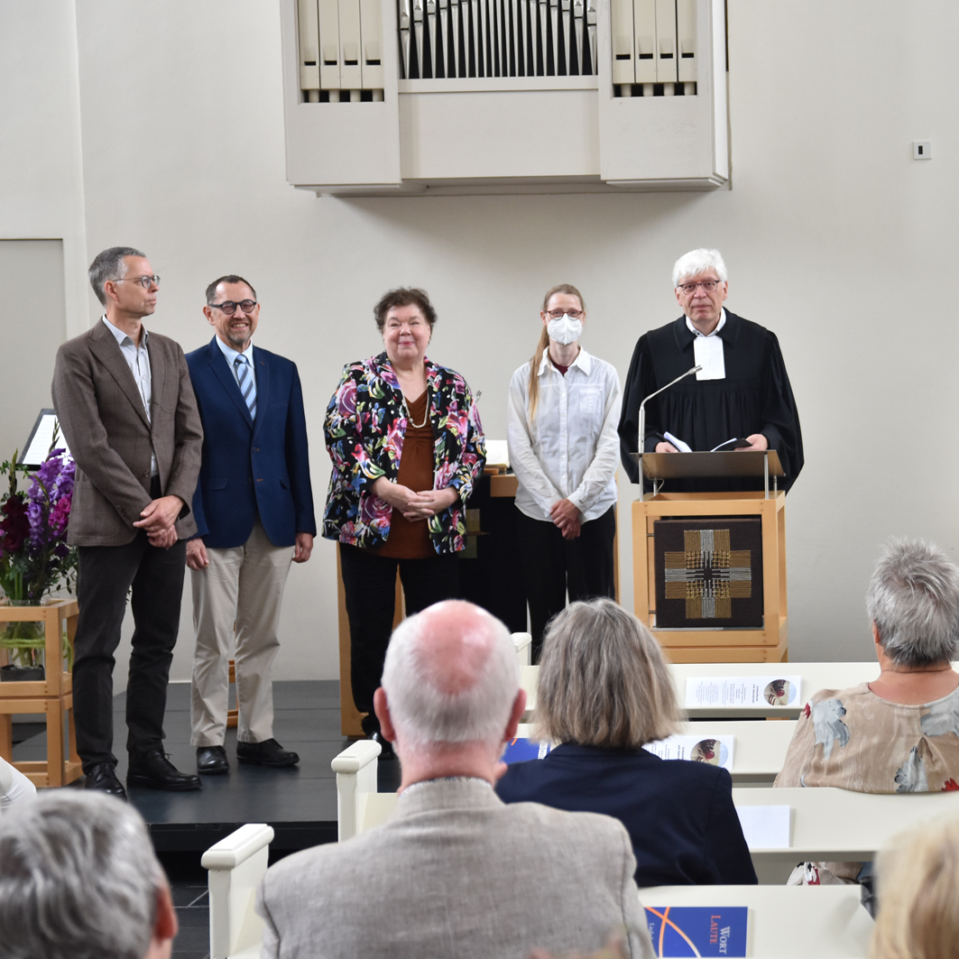 In einem festlichen Gottesdienst im Juli wurden die neuen Presbyterinnen und Presbyter in ihr Amt eingeführt: Martin Rüther, Holger Mienkuß, Dagmar A. Knipping und Helga Sabine Kuhn (im Bild von links nach rechts). Inzwischen hat das Gremiums seine Arbeit aufgenommen.